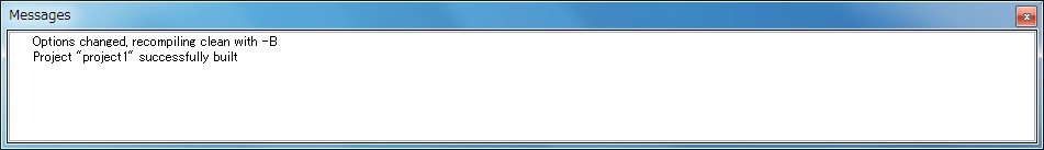 メッセージ画面。プロジェクトファイルをどこか適当なディレクトリに保存して、F9ボタンを押すと、プロジェクトがビルドされ、ウィンドウを表示するだけのプログラムができます。