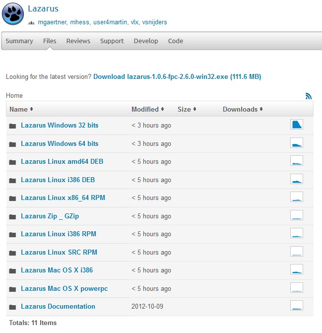 「Lazarus」とぐぐると、 Lazarusのホームページが出てきます。左に「Downloads」というのがあるのでクリックすると、