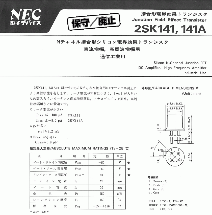 ところが、あるとき、2SK141 という接合型 FET のデータシートを見ていたら、